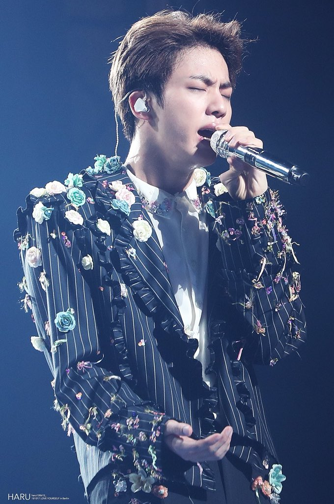 Jin singing “The Truth Untold” wearing a jacket covered in flowers