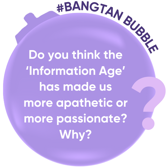 Bangtan Bubble: What was your “Do you think the ‘Information Age’ has made us more apathetic or more passionate? Why?