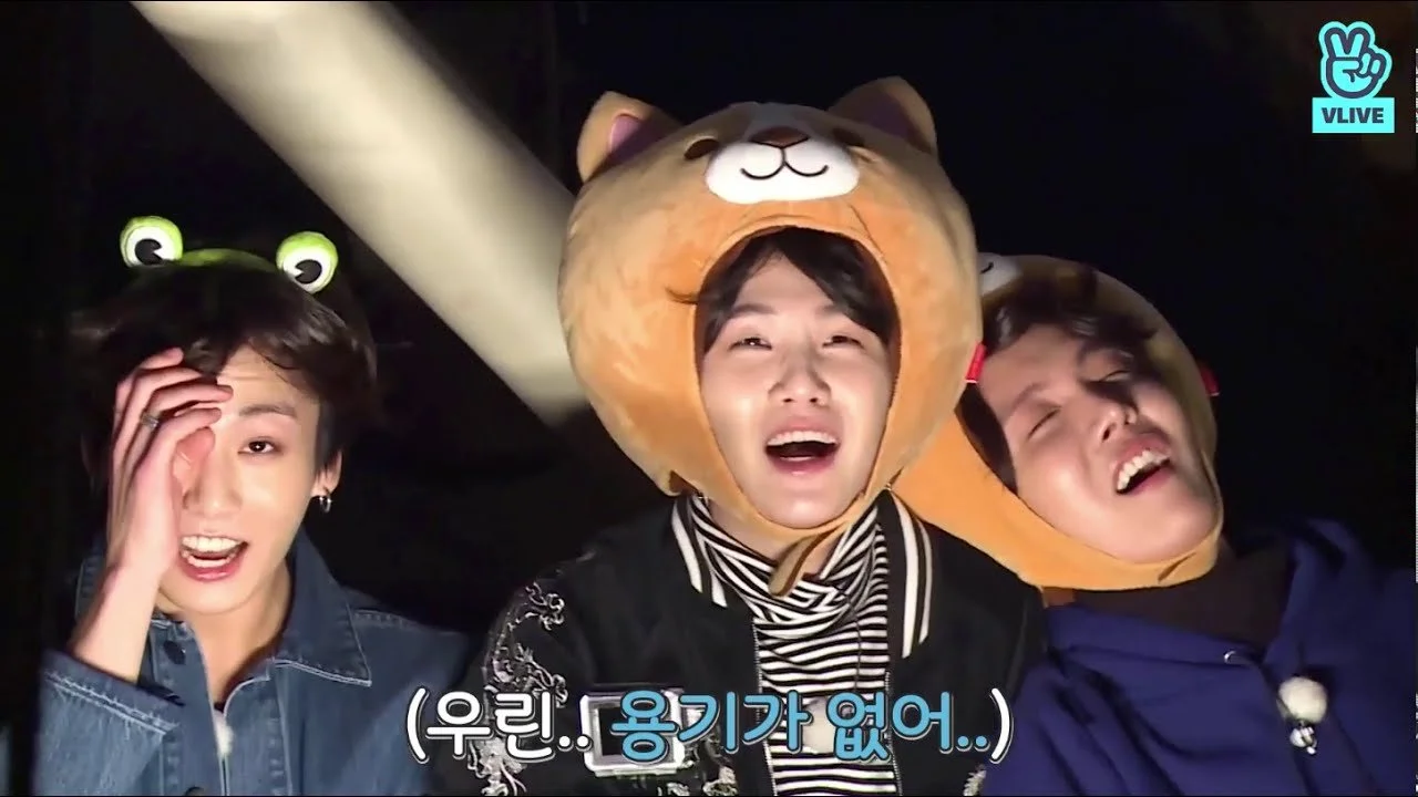 When it’s their turn, Yoongi and Hobi are wearing plushie bear hats and fighting for their lives while Namjoon screams questions at them from across the boat. Neither one of them could care less about what the green fruit is Namjoon is demanding they name… they’re just screaming and wishing it would end. Meanwhile, Taehyung and Jung Kook (who are voluntarily on the ride again) are throwing their hands in the air and having the time of their lives. When the ride does come to a stop, Hobi is clinging pitifully to the side of the ship with just two fingers as he famously “logs out” of his application.
