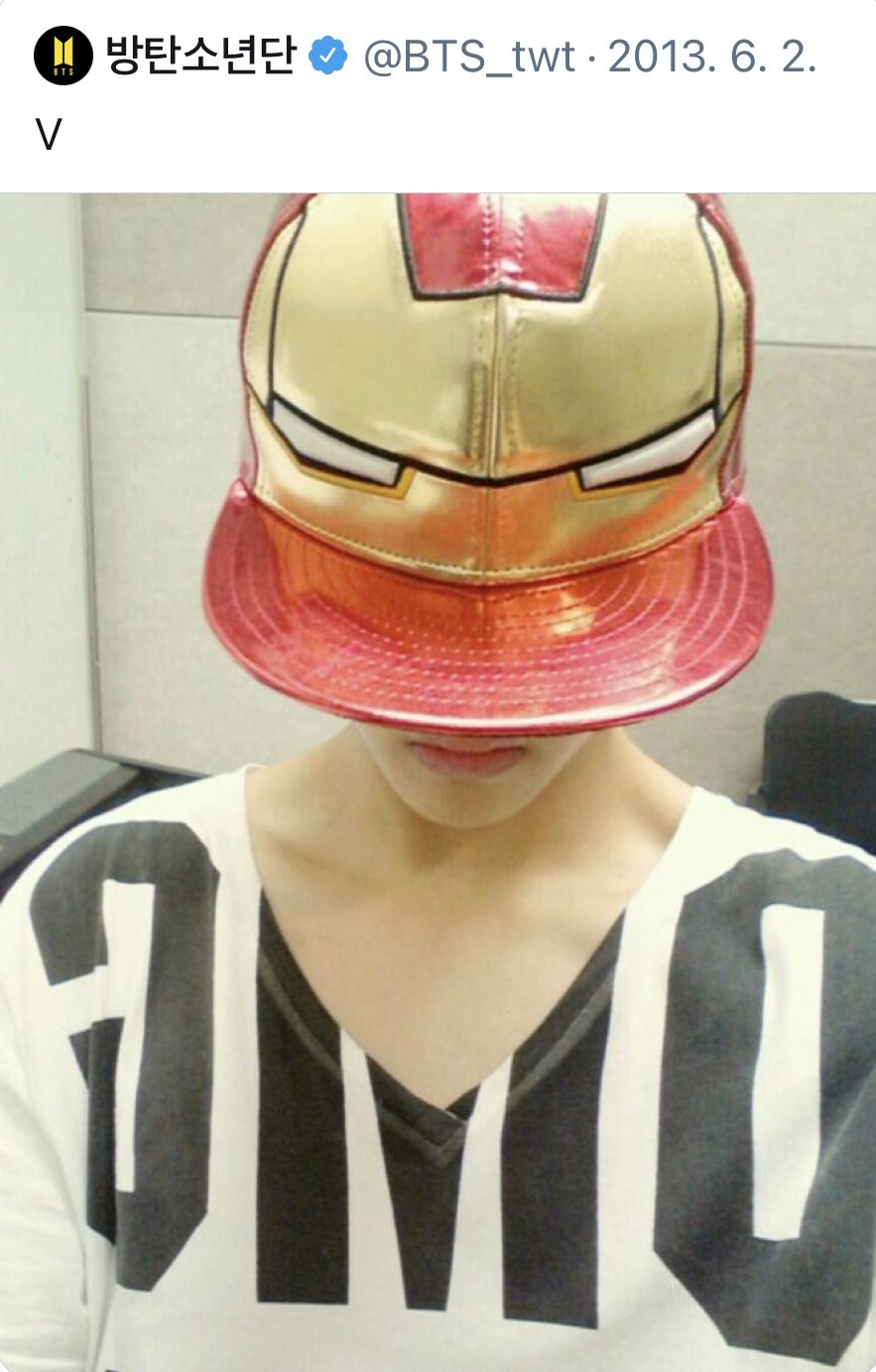 Finally, the company decided it was time, and Taehyung breathed a huge sigh of relief. On June 2, 2013, he made his first post on BTS’ social media, tweeting out a selfie of himself with an Iron Man cap covering up his face. The caption simply read “V”. A few hours later, Big Hit released his first official promotional photo and introduced V to the world.